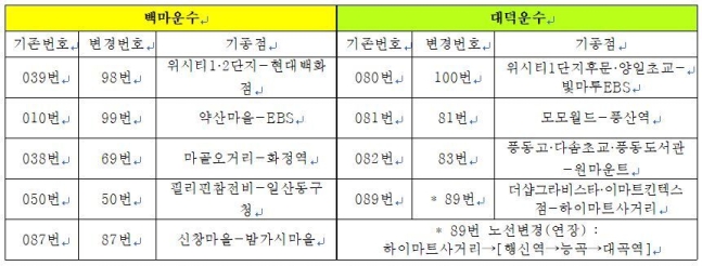 버스번호는 0으로 시작하는 마을버스 번호체계에서 시내버스 번호체계에 따라 새롭게 변경되며, 버스 외부는 마을버스의 노란색에서 시내버스 지정색인 청록색으로 바뀐다.